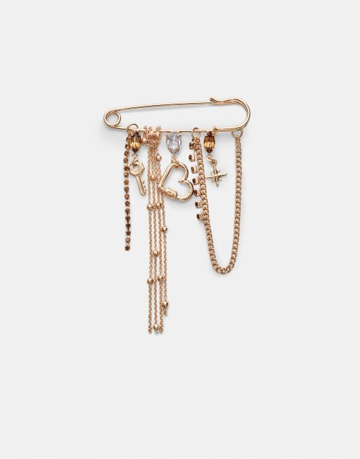Stradivarius – Guldfärgad brosch med strass och hängande kedjor