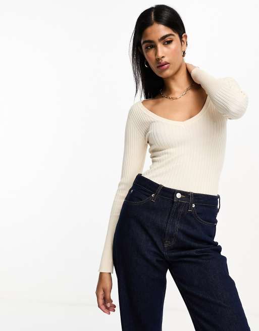 Stradivarius – Havrefärgad stickad tröja med v-ringning