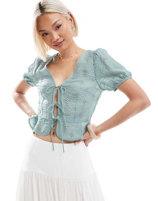 Stradivarius – Kakifärgad blus i kort design med knytning framtill och puffärmar