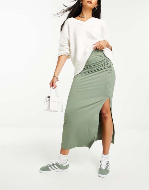 Stradivarius – Kakifärgad maxikjol med sidoslits