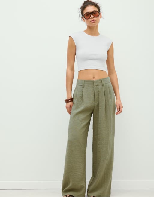 Stradivarius – Kakifärgade, rustika byxor med vida ben och justerbara knappar