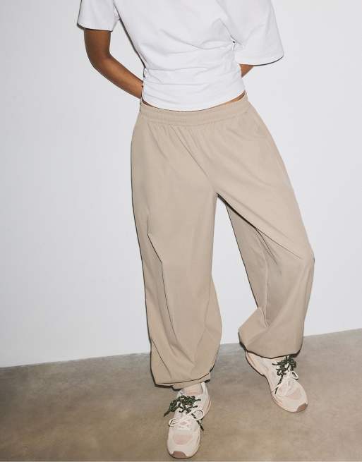 Stradivarius – Ljusbeige fallskärmsbyxor i techmaterial med ballongben