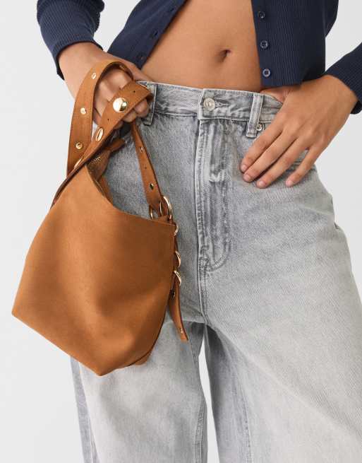 Stradivarius – Ljusbrun axelremsväska i mockaimitation med rem