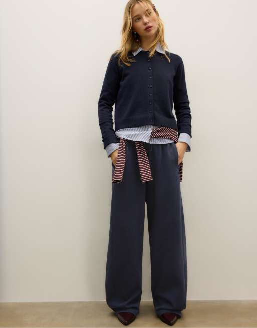 Stradivarius – Marinblå byxor i mjukisstil med extra vida barrelben