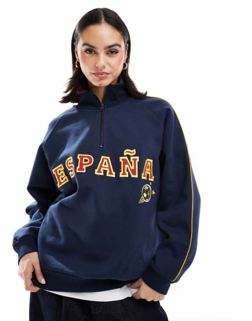 Stradivarius – Marinblå sweatshirt med Espana-tryck och kvartslång dragkedja
