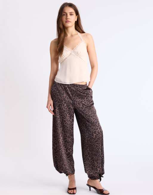 Stradivarius – Mellanbeige, mönstrade, böljande byxor i satin