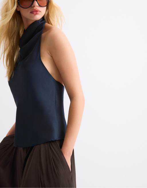 Stradivarius – Mörkblå topp med halterneck och satinkänsla