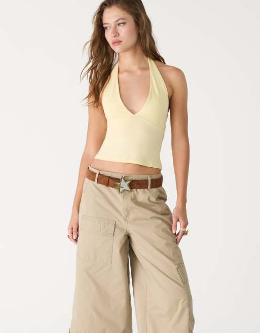Stradivarius – Pastellgul topp med v-ringning och halterneck