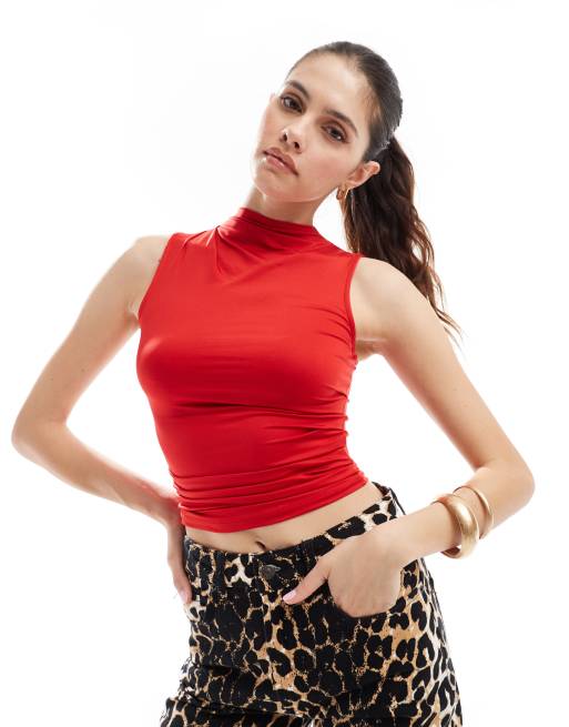 Stradivarius – Rött åtsmitande linne med rynkade detaljer