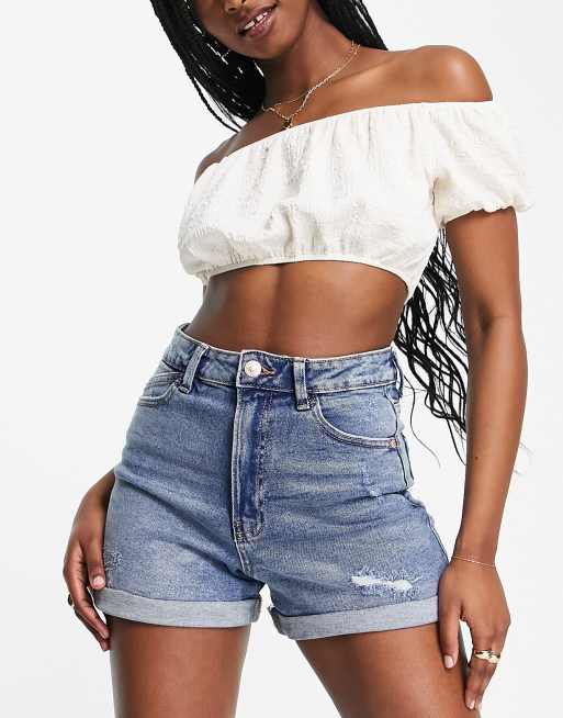 Stradivarius – Smala jeansshorts i mom-modell med mellanljus tvätt och revor