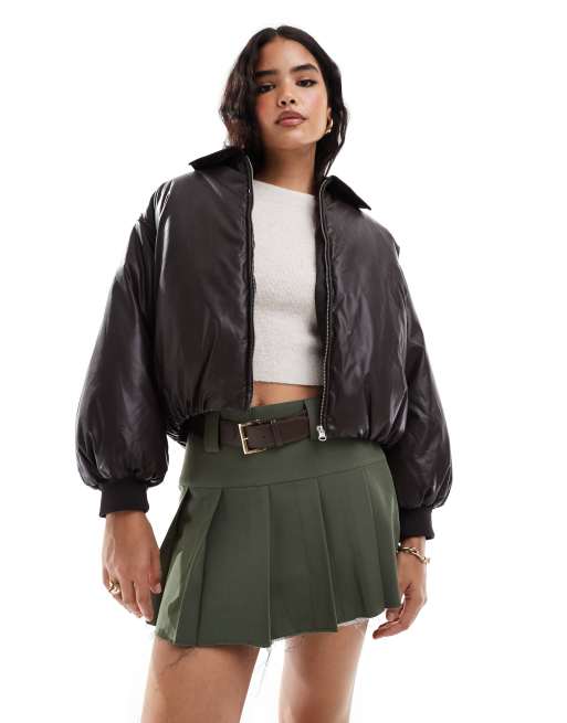Stradivarius – STR – Chokladbrun, kort pufferjacka i läderimitation