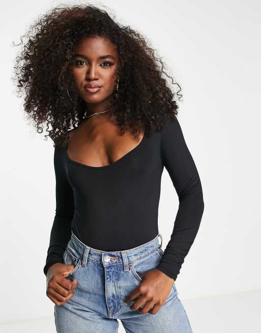 Stradivarius – Svart, formande body i seamless-design med djup halsringning