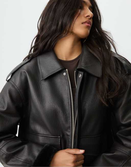Stradivarius – Svart jacka i läderimitation med kontrastdetaljer