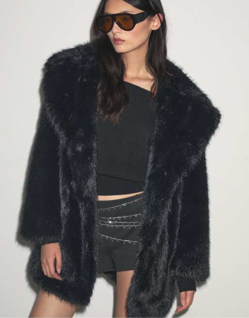 Stradivarius – Svart kappa i fuskpäls och regular fit