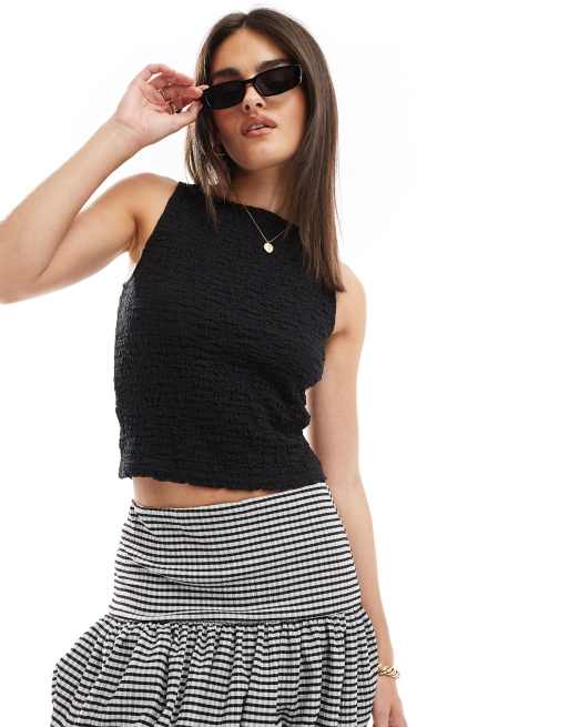 Stradivarius – Svart, krinklad topp med båtringning