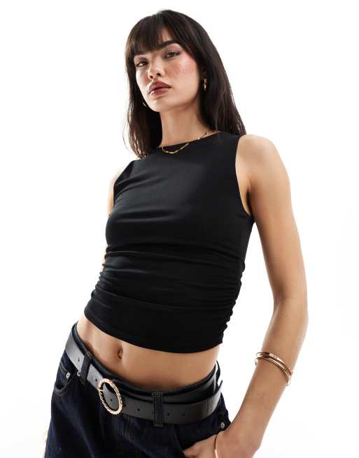 Stradivarius – Svart linne med båtringning och ryschade sidor