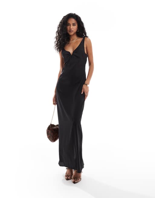 Stradivarius – Svart midiklänning med v-ringning i satin