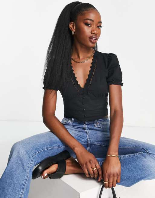 Stradivarius – Svart romantisk topp i bäckebölja med spetskant