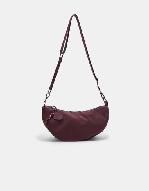 Stradivarius – Vinröd, halvmåneformad axelremsväska i tyg