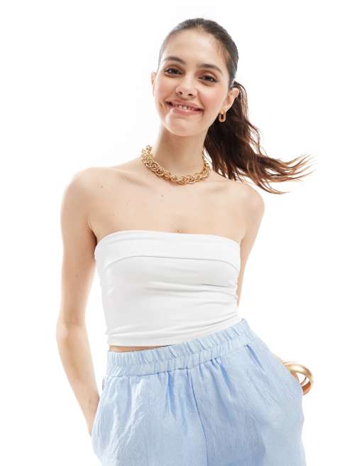 Stradivarius – Vit bandeau-topp med nedvikt detalj i seamless-design