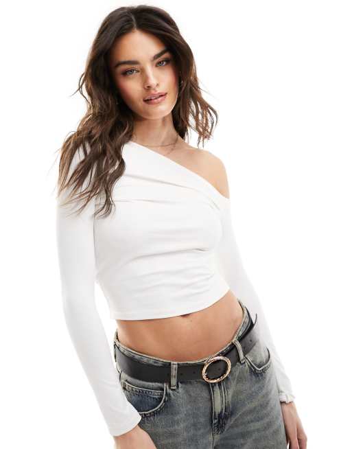 Stradivarius – Vit topp med bar axel och asymmetrisk design