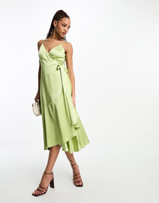 Style Cheat – Limegrön midiklänning med omlottdesign och smala axelband av satin