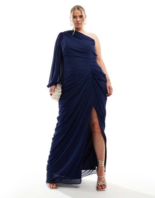 TFNC Plus – Brudtärnor – Marinblå, draperad, enaxlad maxiklänning i chiffong