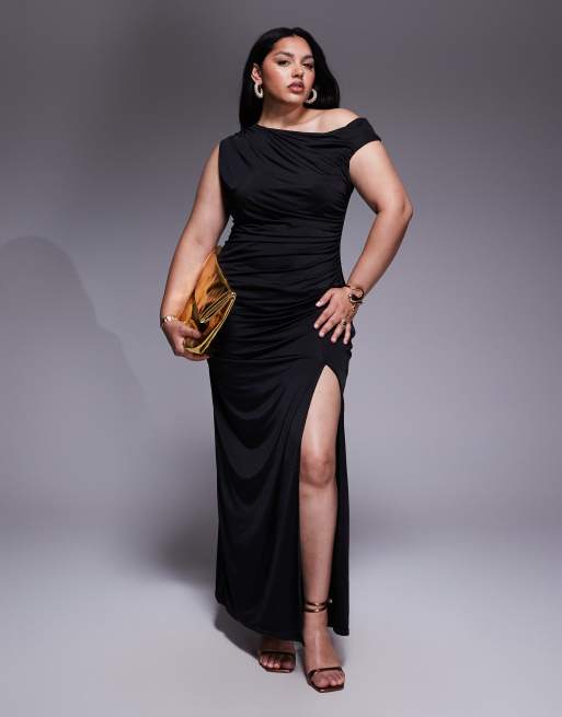 TFNC Plus – Svart, asymmetrisk midiklänning med lårslits