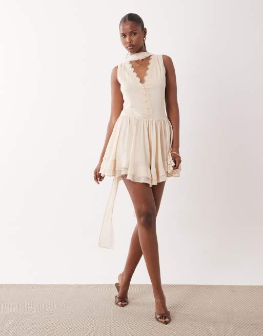 TFNC – Gräddvit playsuit i chiffong med v-ringning, spets och scarfdetalj