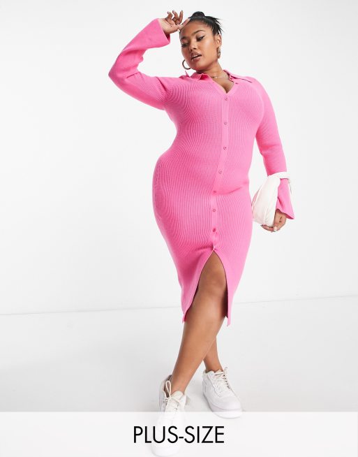 The Frolic – Plusstorlek – Rosa midaxiklänning med knäppning och utställda ärmar