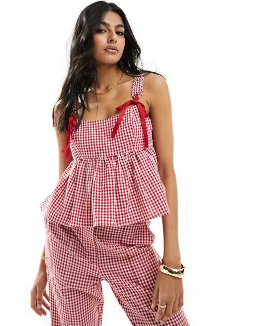 The Frolic – Röd, ginghamrutig, smockad topp med rosett, del av set, exklusivt hos ASOS