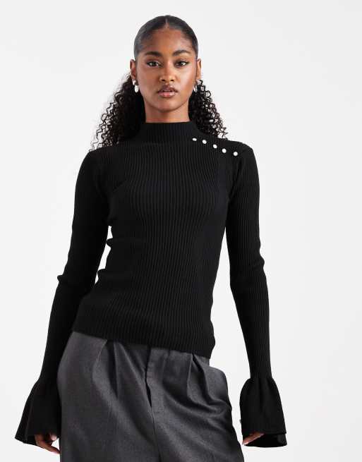 The Frolic – Svart, ribbstickad tröja med pärlor och utsvängda ärmar
