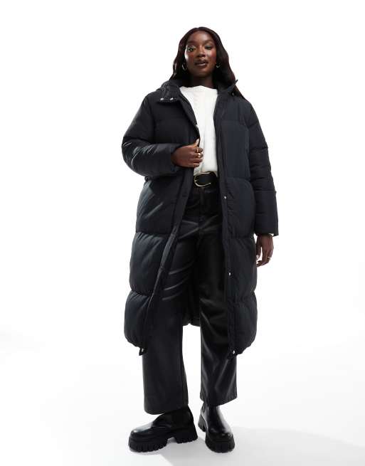 Threadbare – Plusstorlek – Svart pufferkappa i maxilängd med huva