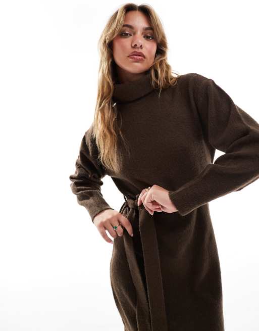 Threadbare – Chokladbrun tröjklänning i midilängd med polokrage och knytning i midjan