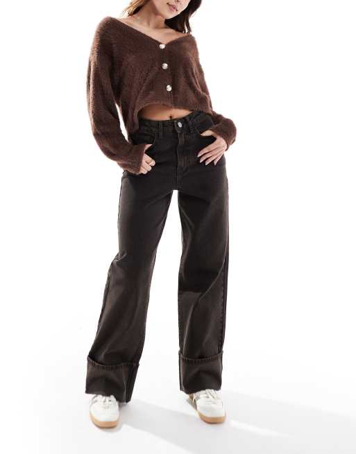 Threadbare – Chokladbruna jeans med vida ben och uppvikt nederkant