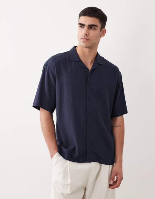 Threadbare – Marinblå, avslappnad skjorta i linnemix med korta ärmar