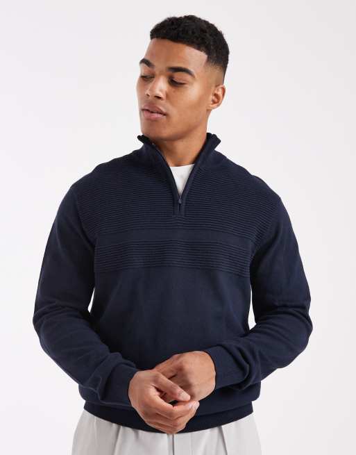 Threadbare – Marinblå, stickad tröja med 1/4-lång dragkedja