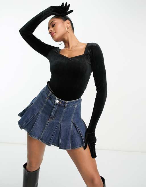 Threadbare – Shannon – Svart body i velour med hjärtformad halsringning och handskar