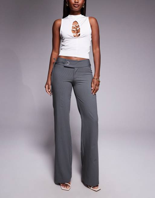 Tiger Mist – Emory – Mörkgrå, kritstrecksrandiga, figursydda, utsvängda byxor med låg midja, öljetter och knytning i sidan i 90-talsstil