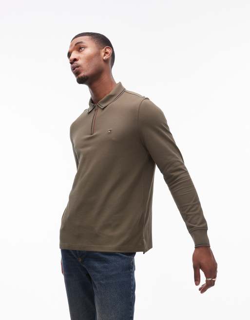 Tommy Hilfiger – Militärgrön pikétröja med långa ärmar och halvlång dragkedja