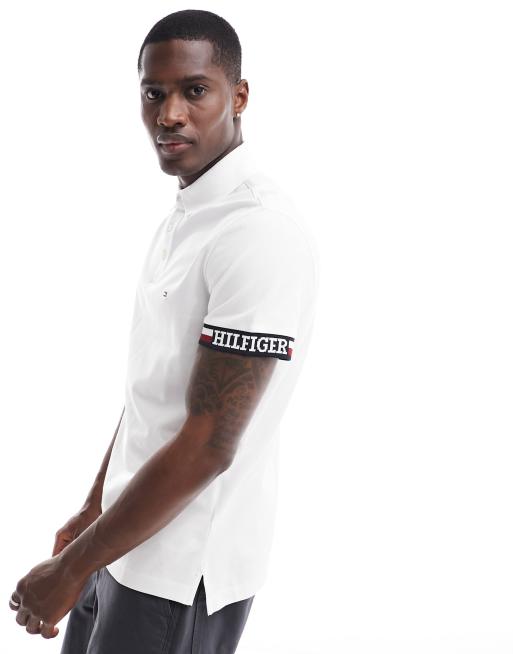 Tommy Hilfiger – Vit smal pikétröja med flagglogga på muddarna