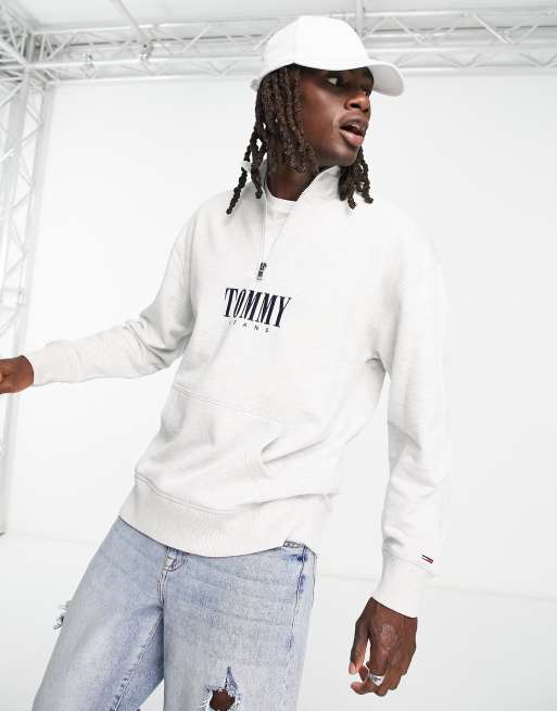 Tommy Jeans – Gråmelerad, avslappnad sweatshirt med autentisk logga och dragkedja vid halsen