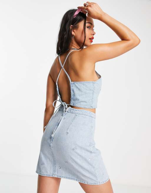 Tommy Jeans – Ljusblå jeanstopp med heltäckande mönster och knytning baktill i bomull, del av set - LBLUE