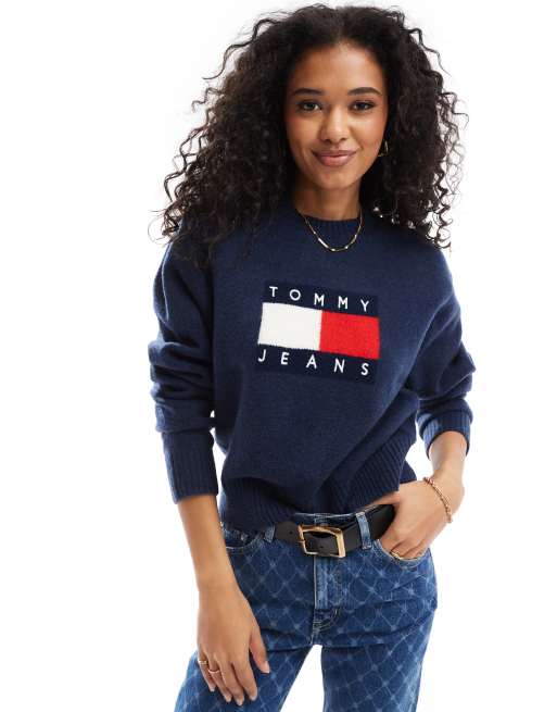 Tommy Jeans – Marinblå, melerad tröja med flagglogga