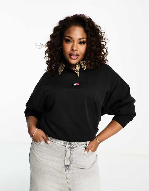 Tommy Jeans Plus – Svart rugby-topp i oversize med leopardmönstrad krage