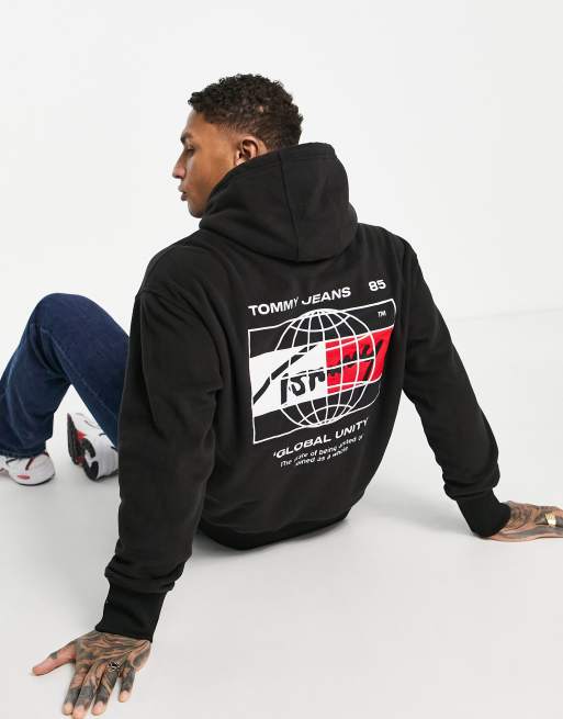 Tommy Jeans – Svart avslappnad huvtröja i polarfleece med jordglobstryck baktill