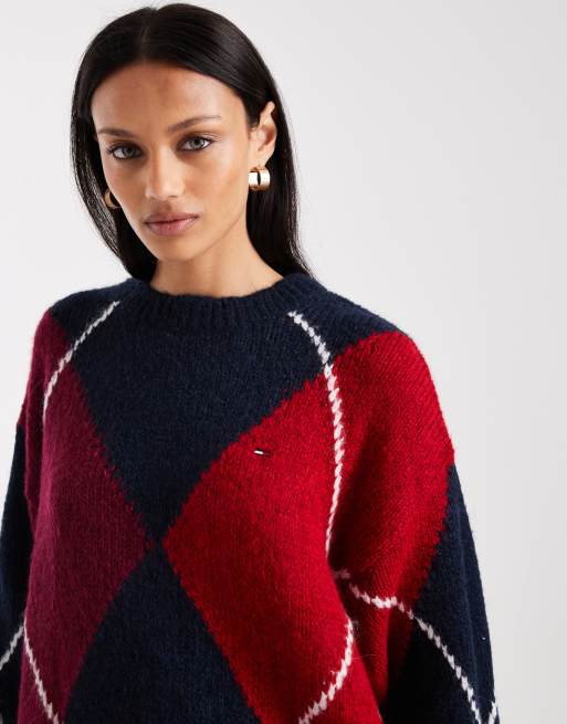 Tommy Jeans – Vinröd och marinblå tröja med argylemönster