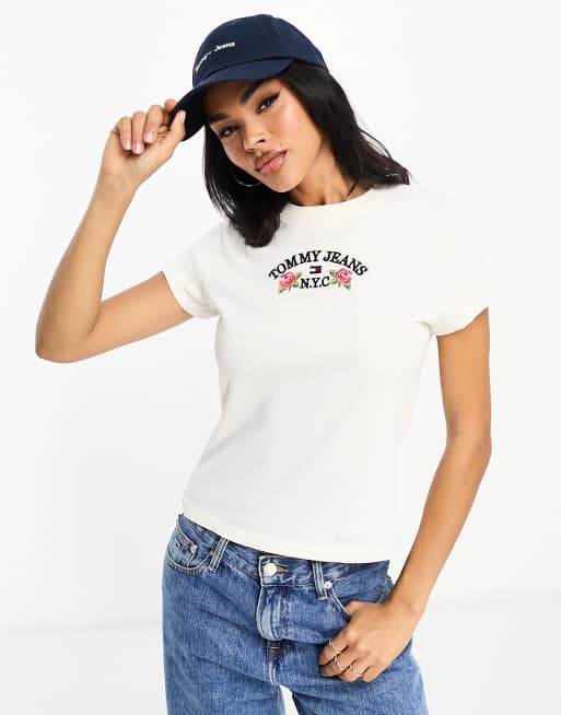 Tommy Jeans – Vit, kortärmad t-shirt i liten modell med flagga och blomma