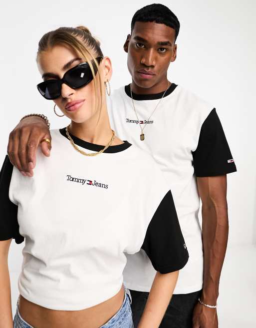 Tommy Jeans – Vit t-shirt i unisex-modell med klassisk logga och kontrastfärgade ärmar