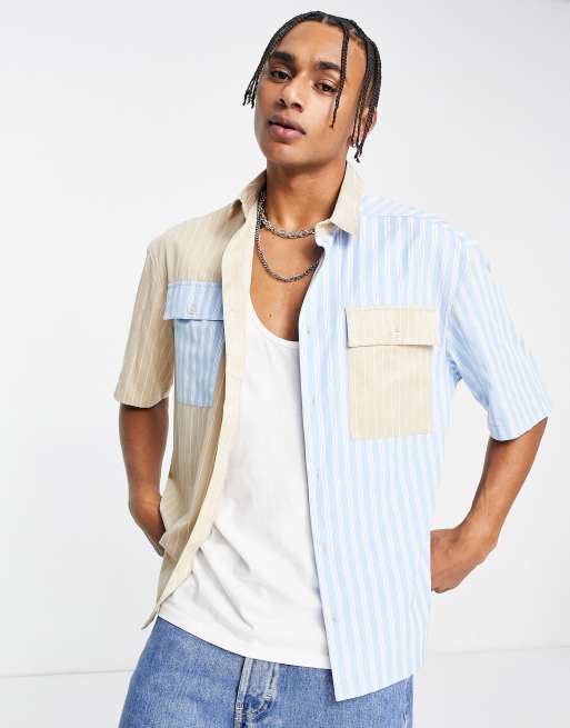 Topman – Beige och blå skjorta i oversize med delade ränder
